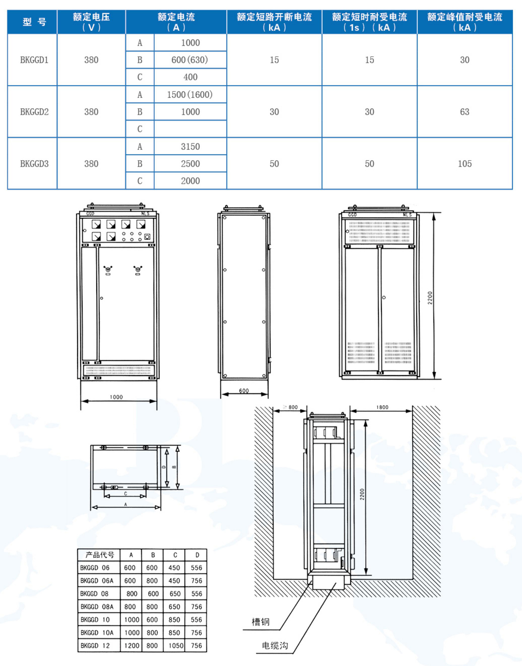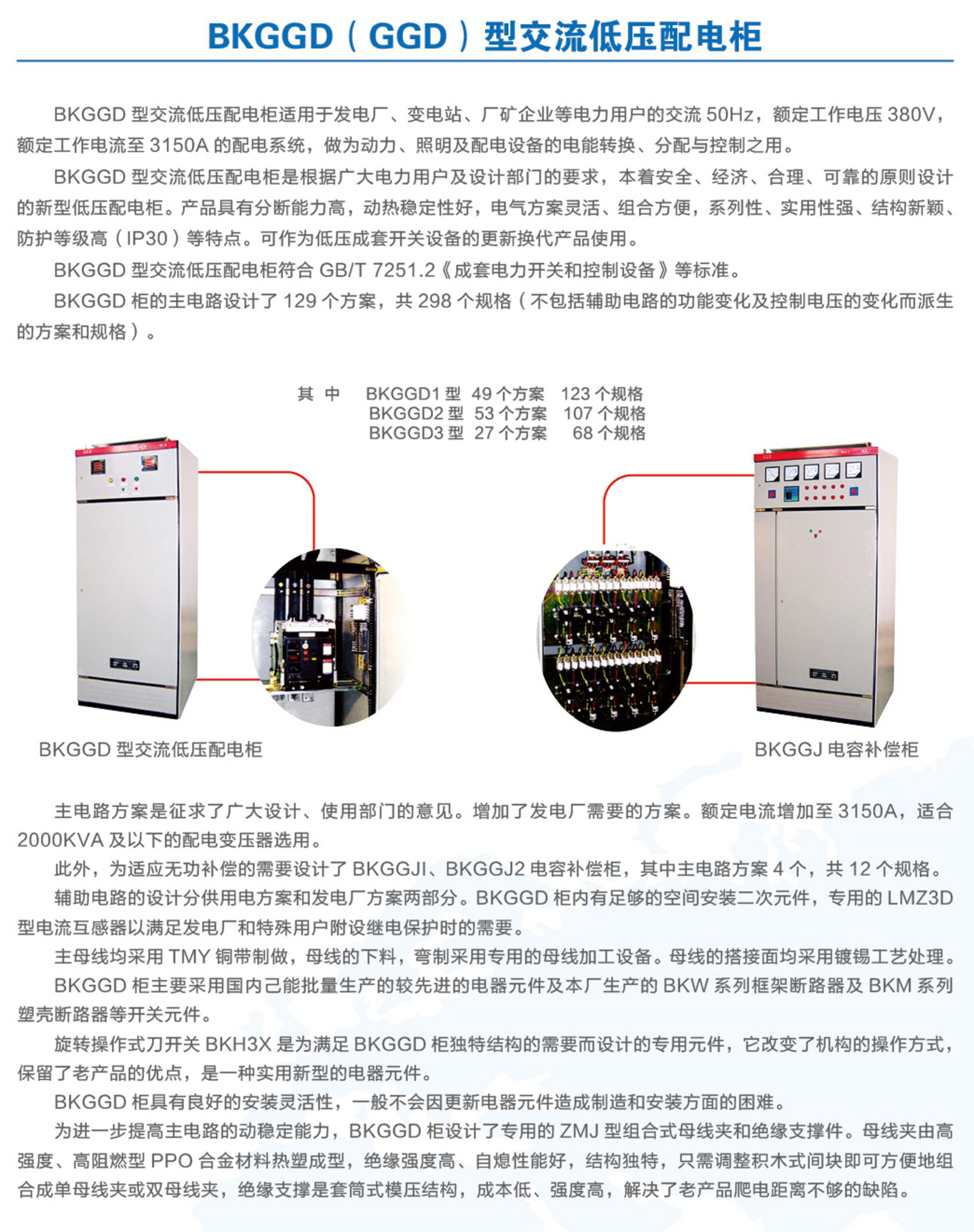BKGGD型交流低压配电柜适用于发电厂、变电站、厂矿企业等电力用户的交流50Hz,额定工作电压380V,额定工作电流至3150A的配电系统,做为动力、照明及配电设备的电能转换、分配与控制之用。BKGGD型交流低压配电柜是根据广大电力用户及设计部门的要求,本着安全、经济、合理、可靠的原则设计的新型低压配电柜。产品具有分断能力高,动热稳定性好,电气方案灵活、组合方便,系列性、实用性强、结构新颖、防护等级高等特点。可作为低压成套开关设备的更新换代产品使用。