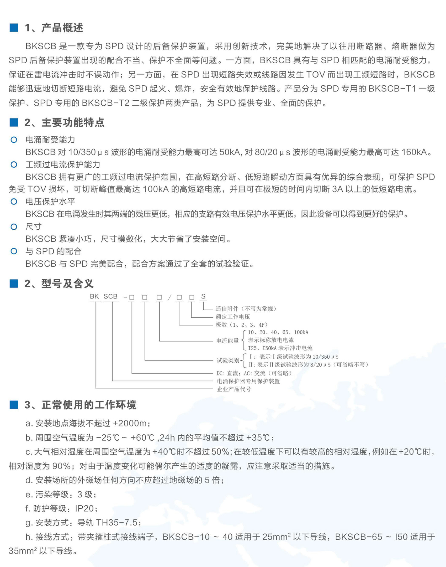 BKSCB系列电涌?;て髯ㄓ帽;ぷ爸檬视糜诮涣?0Hz/60Hz、额定工作电压至400V,需安装SPD(防雷保护器)设备的电路中,为试验类别为Ⅰ类和II类的电涌?;て魈峁┳ㄒ档暮蟊副;ぁ1静贩螻B/T 42150标准。